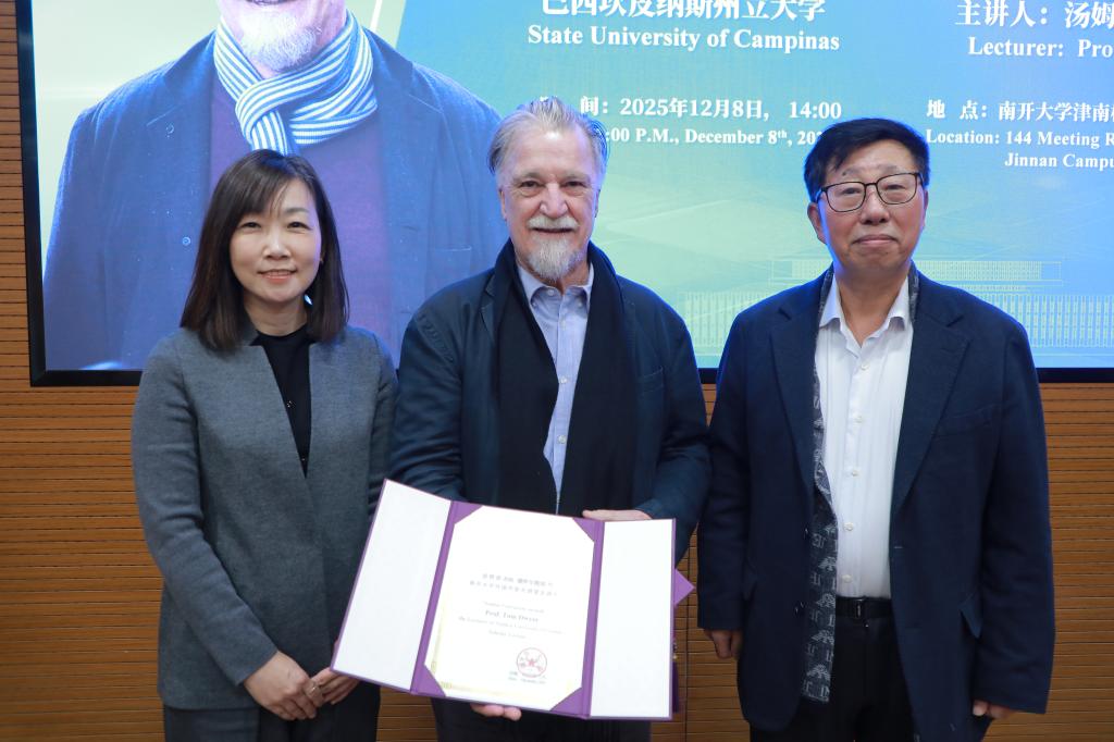 2025年12月8日下午,南开大学在津南校区社会学院举办“外国专家大讲堂·海外学者讲座”,巴西坎皮纳斯州立大学社会学家汤姆·德怀尔(Tom Dwyer)教授应邀作《中巴青年研究的关键启示:文明对话与现代化进程背景下的思考》报告。国际交流处副处长李华与社会学院院长张文宏教授共同为德怀尔教授颁发主讲证书。