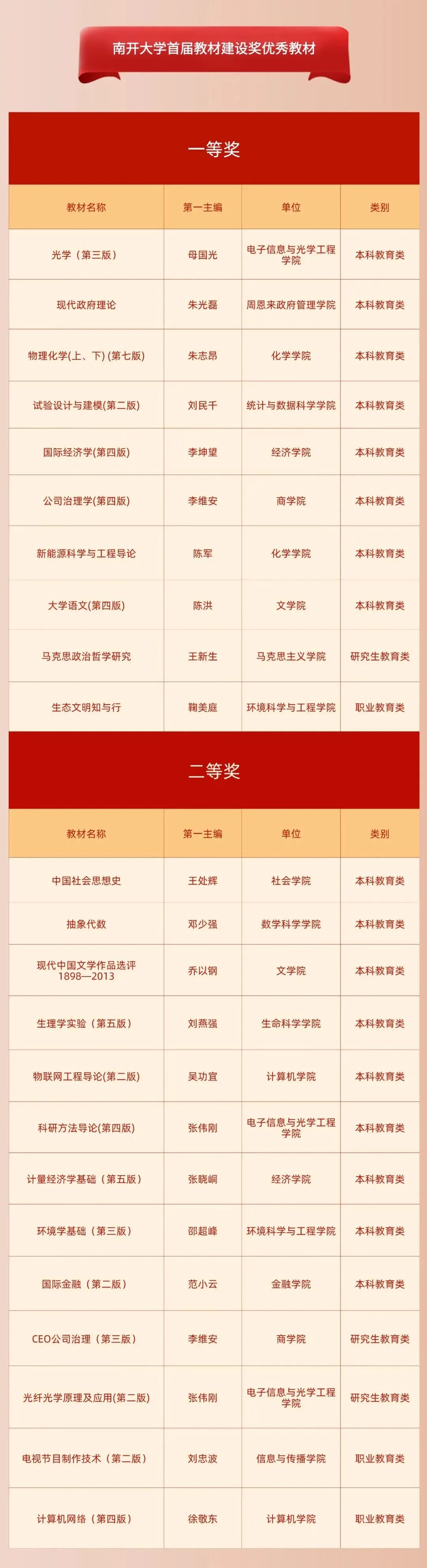 南开大学教材建设奖是面向本科教育、研究生教育和职业与继续教育领域的教材工作奖励项目,旨在深入贯彻习近平新时代中国特色社会主义思想和习近平总书记关于教材建设的重要指示精神,通过表彰优秀教材、先进集体和先进个人,增强教材工作者的荣誉感与责任感,加强经典教材传承与发展,打造更多培根铸魂、启智增慧的精品教材。