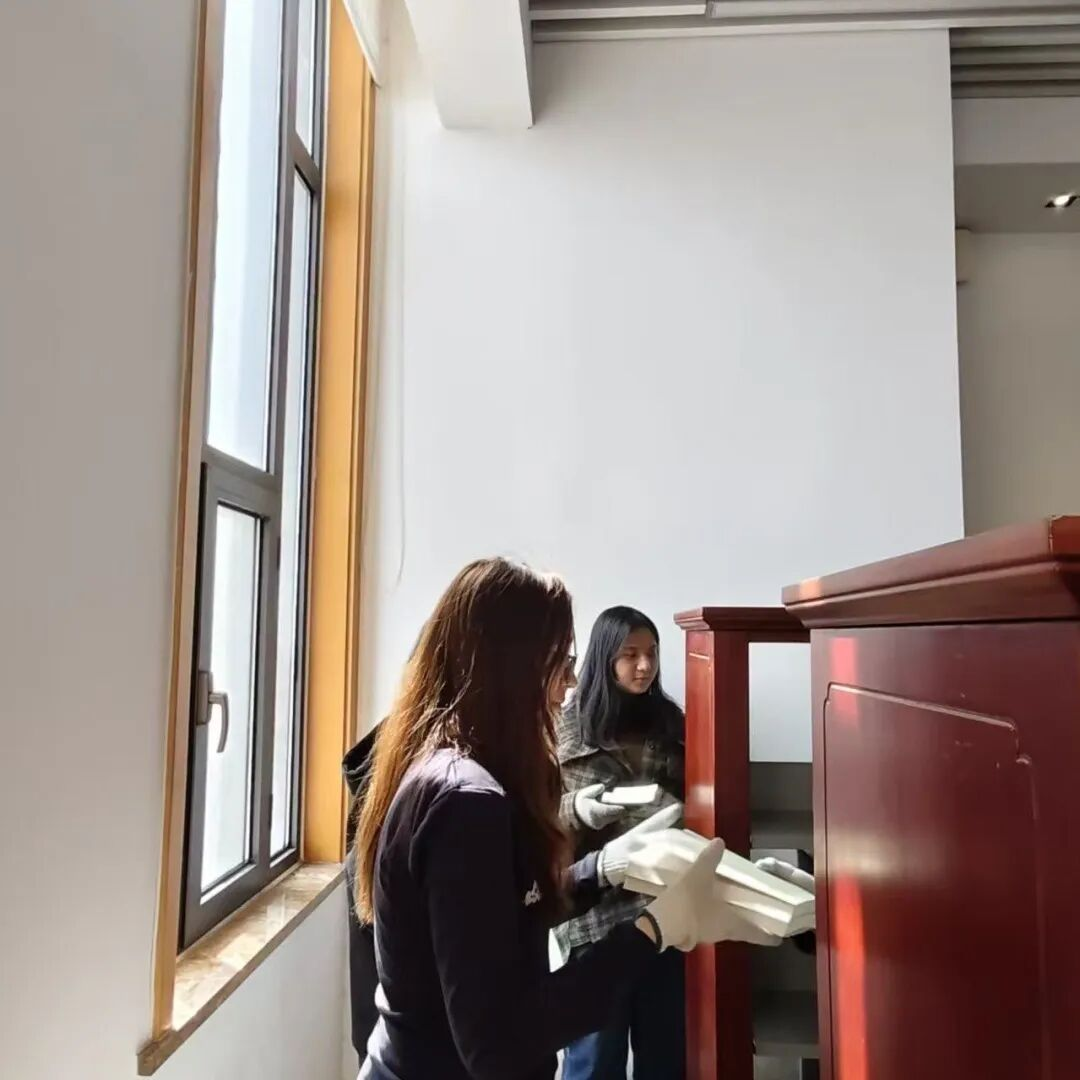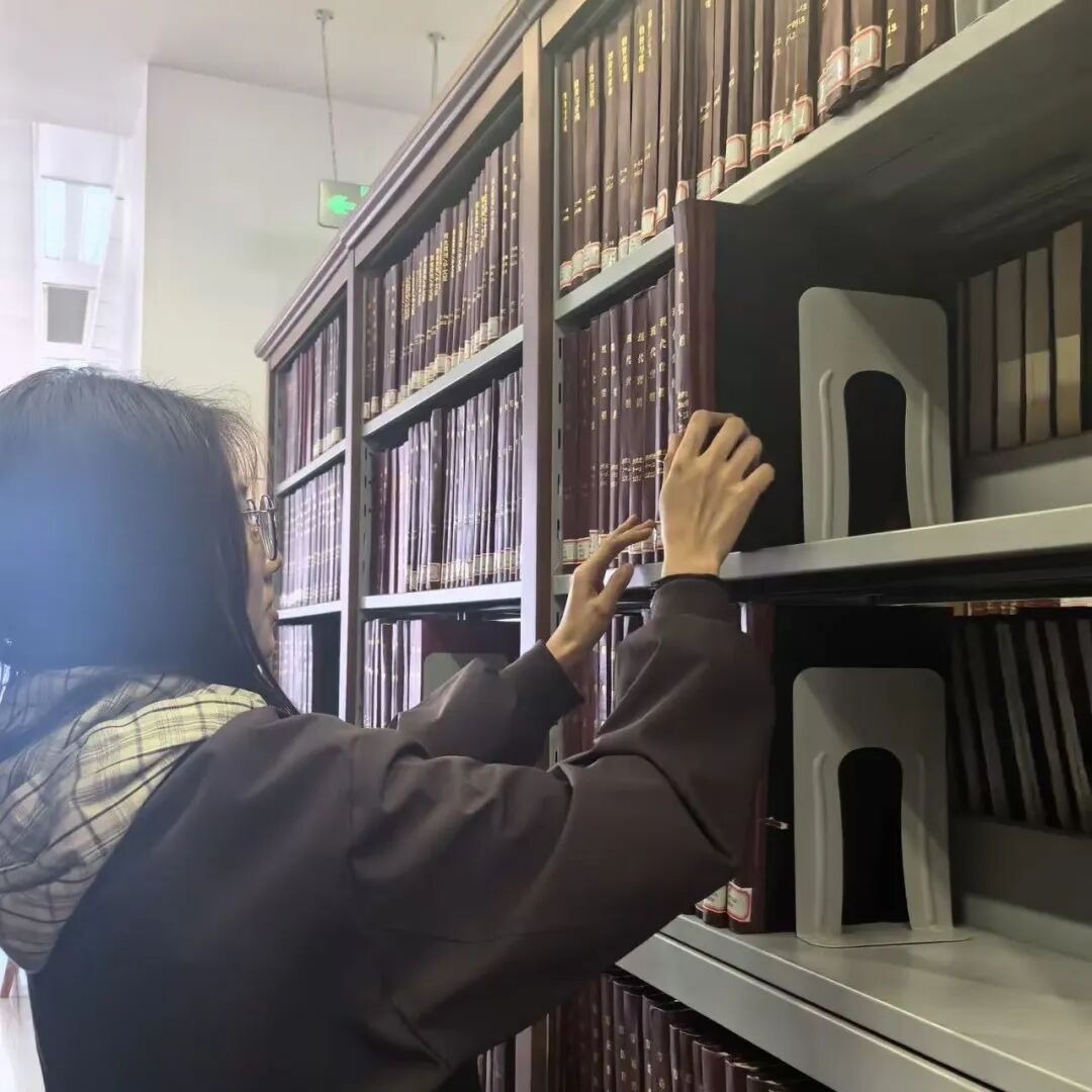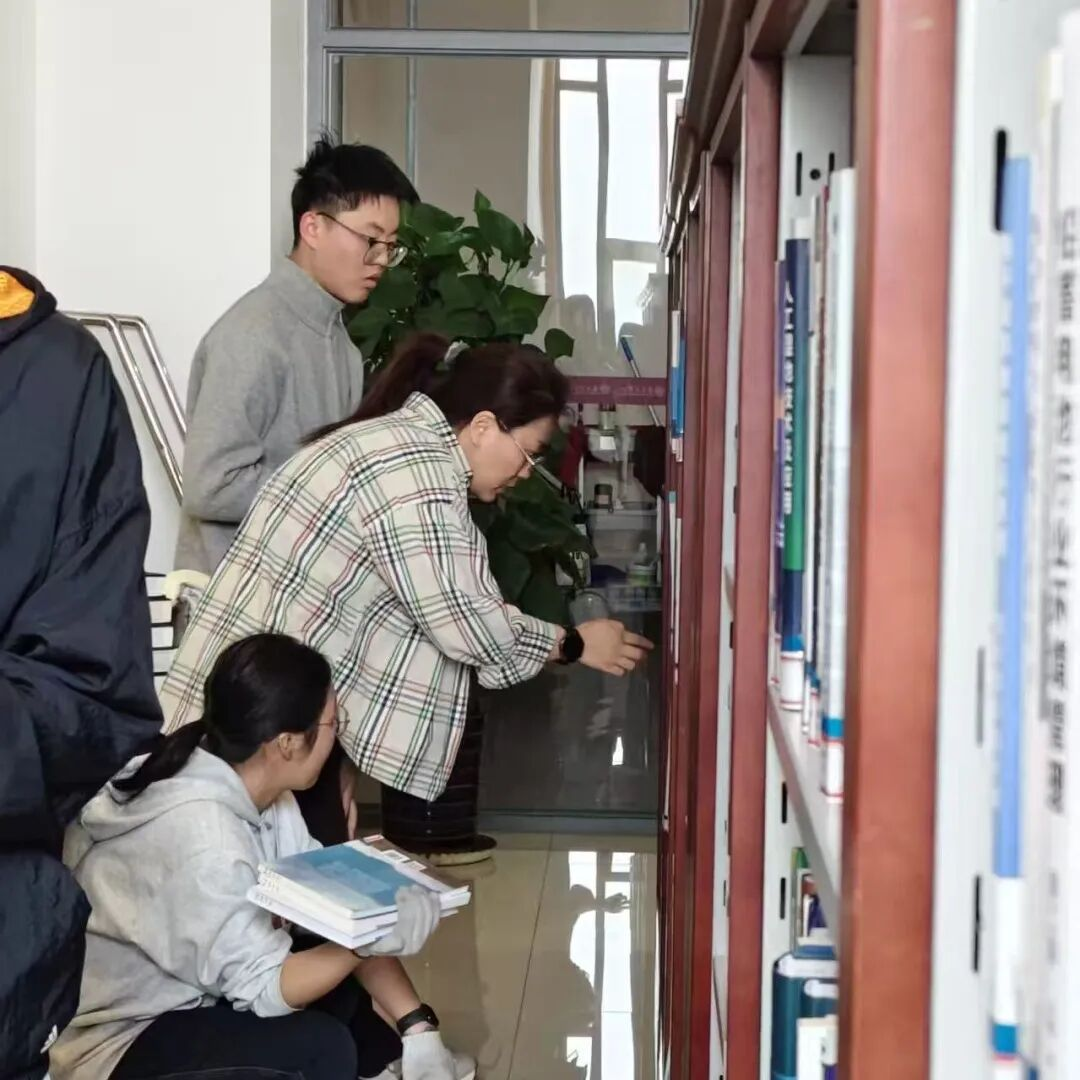 与上一期不同,这次同学们面对的不是成摞待搬运的书堆,而是需要仔细分辨、按序归位的“散装”书籍。大家先将待入库的图书按学科类别和索书号范围分成若干组,再对照书架的分区标识,一本本放到对应的架层上。有人蹲在地上分类,有人穿 梭于书架间查找空位,有人负责最终上架。原本散落各处的书籍,经过一道道工序,最终整齐地排列在各自的位置上。